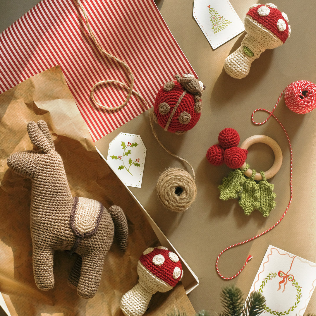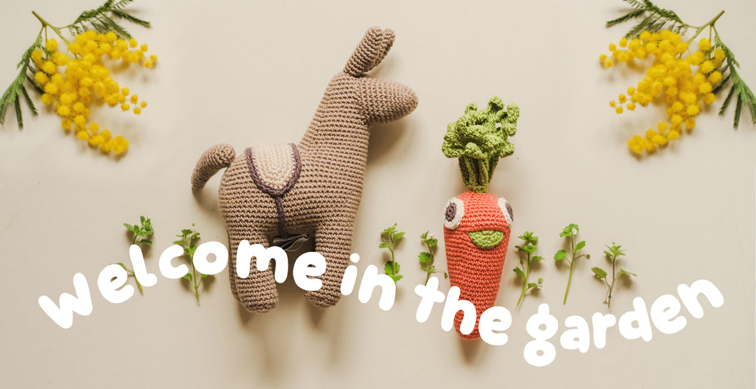 Hochets, doudous, boîtes à musique en crochet pour bébé ... conçus en adéquation avec les valeurs qu’ils partagent. Ces jouets green & engagées transmettent ces notions essentielles : L’amour de la Nature et l’alimentation saine.