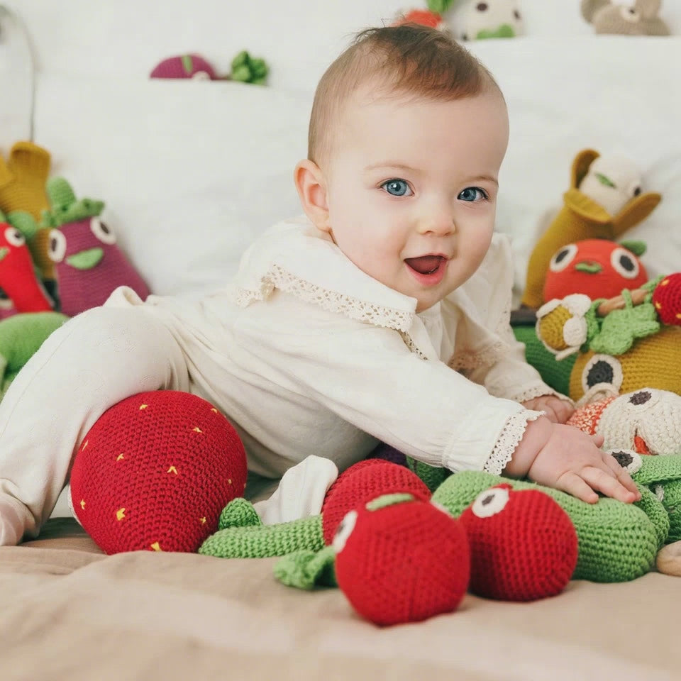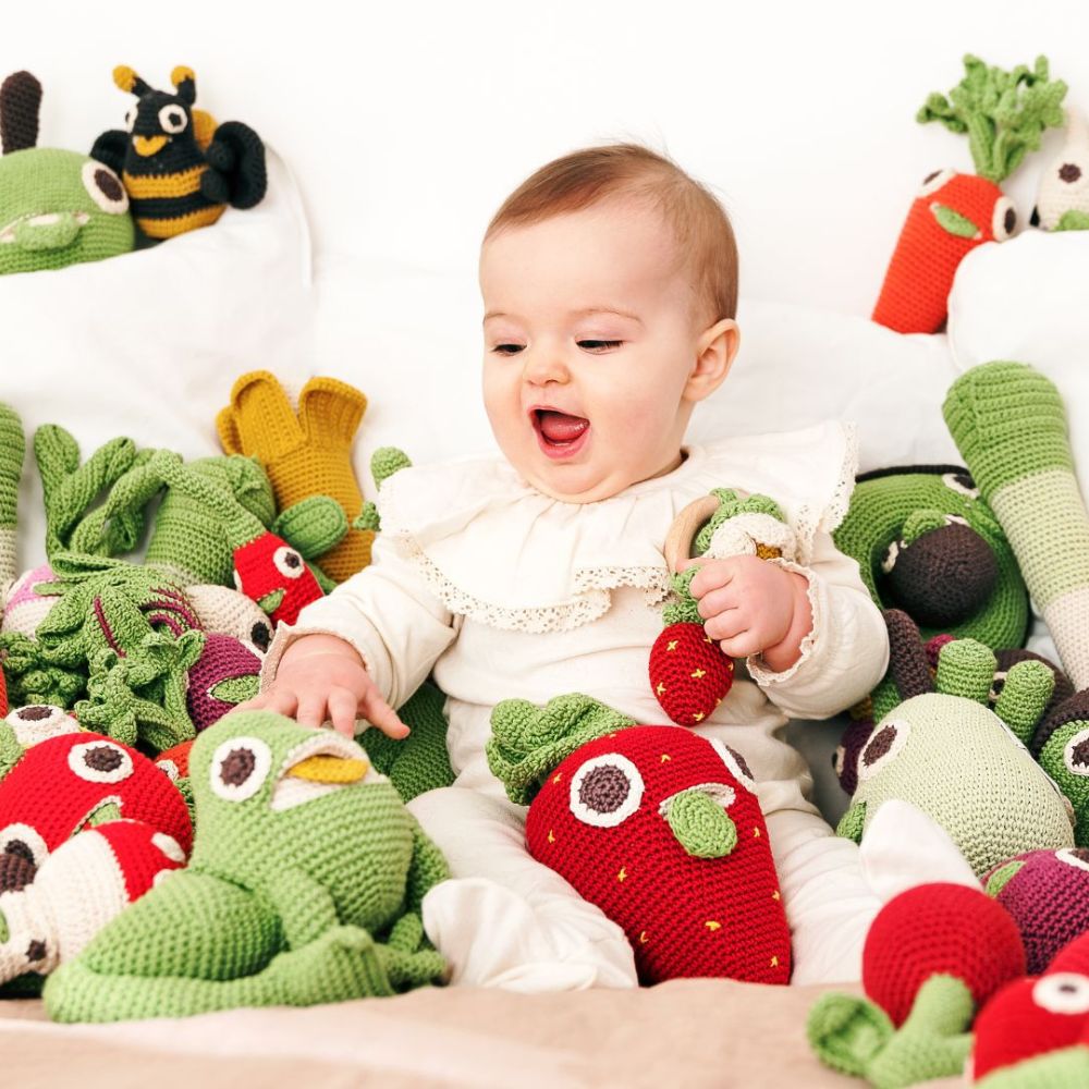 Crochet gives our toys a unique, compact, and curiously stimulating texture for little exploring hands. This traditional craft technique creates a textured relief that babies love to discover with their fingertips and explore with their mouths. Since touch is the first sense to develop in the fetus, our VEGGY TOYS offer a rich and rewarding sensory experience.